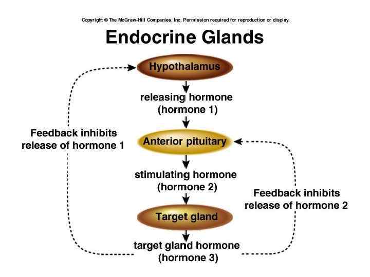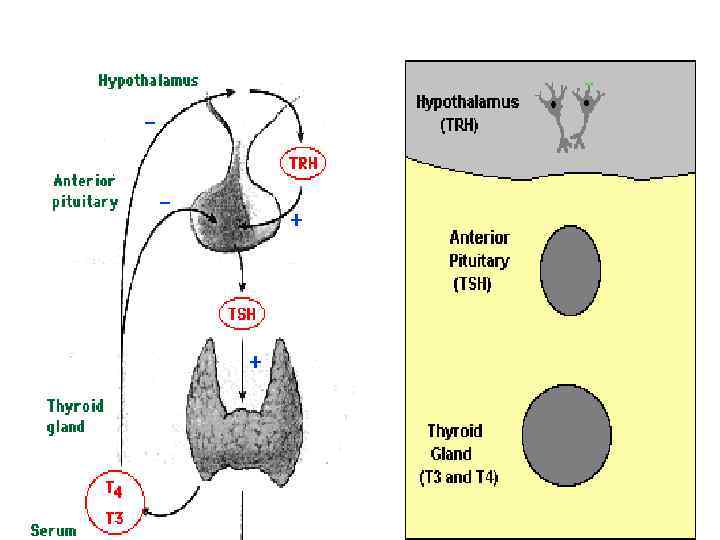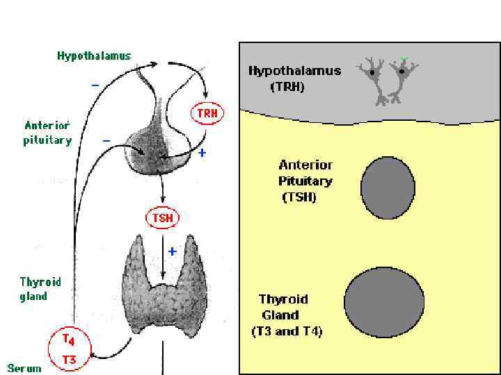 Нарушения регуляции эндокринных желез Нарушение механизмов обратной связи Эмоции Травма Гипоталамус ТРГ КРГ Интоксикация Афферентная импульсация Гипофиз (передняя доля) Т 3 и Т 4 Щитовидная железа АКТГ ТТГ Кортизол Кора надпочечников