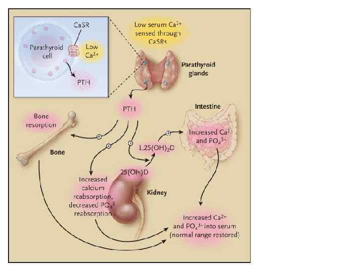 Механизмы вторичного гиперпаратиреоидизма при почечной недостаточности • Гиперфосфатемия и отрицательный кальциевый баланс • Недостаточное образование 1, 25 дигидровитамина Д 3 • Снижение плотности кальциевых рецепторов на паращитовидных железах • Увеличение концентрации цитокинов • Резистентность к ПТГ • Замедление клиренса ПТГ
