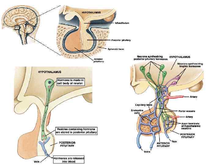 Гипоталамус и гипофиз Гонадотропины (ФСГ, ЛГ) Антидиуретический гормон (АДГ) Канальцы почек Окситоцин Задний гипофиз Сосудистая система Передний гипофиз Гладкая мускулат. матки Окситоцин Молочная железа Половые железы Гомон роста (СТГ) Кости ткани Тиротропный гормон (ТТГ) Щитов. железа Адренокортикотропный гормон (АКТГ) Кора надпочечн. Пролактин Молочная железа