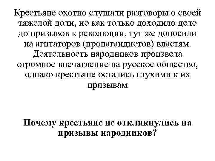 Крестьяне охотно слушали разговоры о своей тяжелой доли, но как только доходило дело до призывов к революции, тут же доносили на агитаторов (пропагандистов) властям. Деятельность народников произвела огромное впечатление на русское общество, однако крестьяне остались глухими к их призывам Почему крестьяне не откликнулись на призывы народников?
