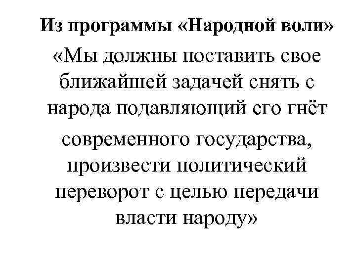 Из программы «Народной воли» «Мы должны поставить свое ближайшей задачей снять с народа подавляющий его гнёт современного государства, произвести политический переворот с целью передачи власти народу»