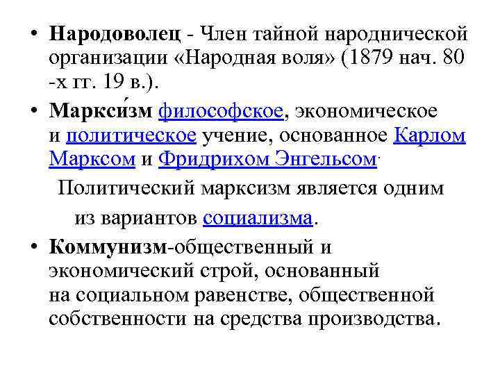 • Народоволец - Член тайной народнической организации «Народная воля» (1879 нач. 80 -х гг. 19 в. ). • Маркси зм философское, экономическое и политическое учение, основанное Карлом Марксом и Фридрихом Энгельсом. Политический марксизм является одним из вариантов социализма. • Коммунизм-общественный и экономический строй, основанный на социальном равенстве, общественной собственности на средства производства.
