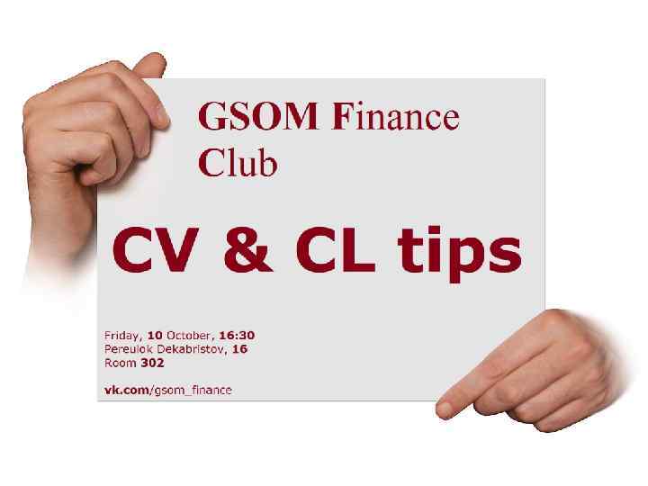 Почему это важно? CV Ваш «пропускной билет» в компанию… Должен обогнать 24 конкурентов… При просмотре рекрутером за 30 секунд (CV ) и 15 секунд (CL) Умение описывать себя в деловом формате всегда пригодится! GSOM Finance Club vk. com/gsom_finance CL