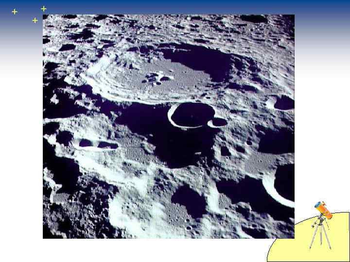 Горные районы Луны. • Светлые части Луны – это её горные районы. На Луне есть высокие горные хребты и много кольцевых гор – кратеров. Кратеры – большие ямы, окруженные холмами. Некоторые из этих кратеров образовались при падении на Луну метеоритов. Самые крупные кратеры образовались при извержении вулканов.