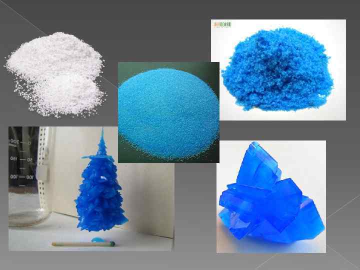 Получение медного купороса Cu. SO 4 + H 2 O Cu. SO 4 * 5 H 2 O Белый порошок кристаллы Синие