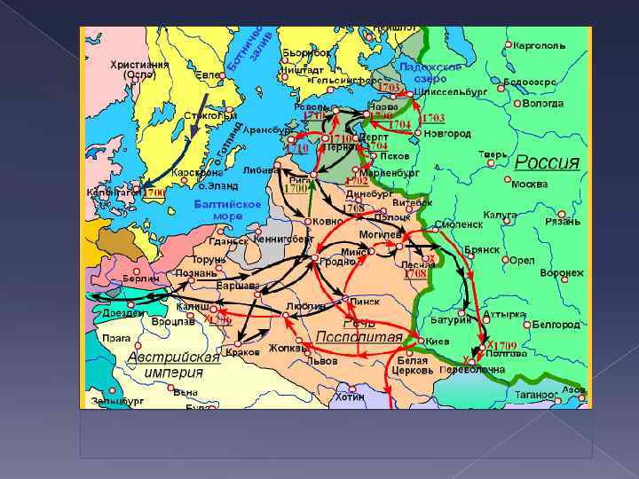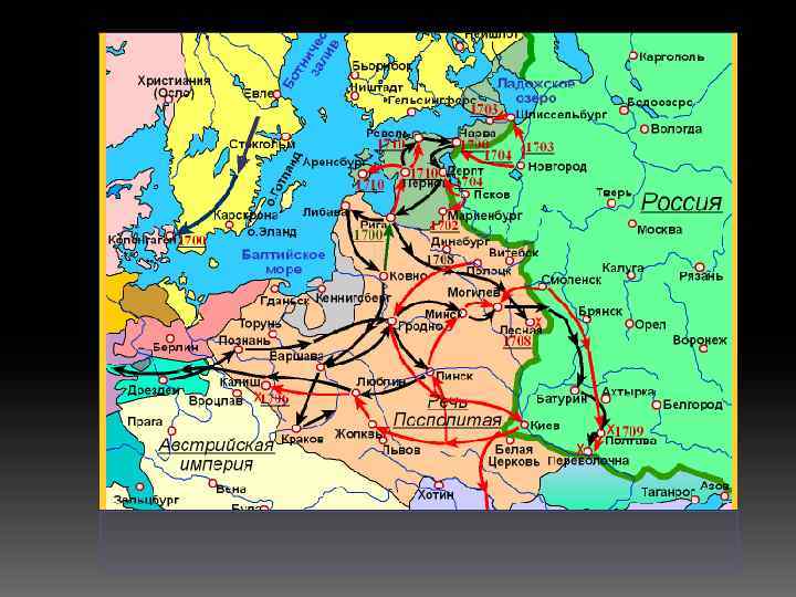 Прутский поход Петра против турок - 1711 г. Итоги: 1. Россия возвращала Турции Азов. 2. Карл XII вернулся в Швецию. 3. Запрещено держать армию в Речи Посполитой НО Россия сохранила армию, оружие и артиллерию.