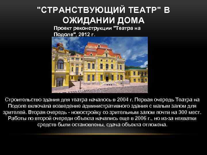 "СТРАНСТВУЮЩИЙ ТЕАТР" В ОЖИДАНИИ ДОМА Проект реконструкции "Театра на Подоле", 2012 г. Строительство здания для театра началось в 2004 г. Первая очередь Театра на Подоле включала возведение административного здания с малым залом для зрителей. Вторая очередь - новостройку со зрительным залом почти на 300 мест. Работы по второй очереди объекта начались еще в 2006 г. , но из-за нехватки средств были остановлены, сдача объекта отложена.