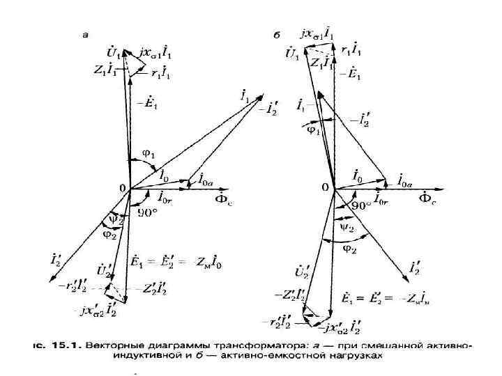 • В случае активно-емкостной нагрузки векторная диаграмма трансформатора имеет вид, показанный на рис. б. Порядок построения диаграммы остается прежним, но вид ее несколько изменяется. Ток в этом случае опережает по фазе ЭДС на угол • Иногда векторную диаграмму трансформатора строят с целью определения ЭДС обмоток. В этом случае заданными являются параметры вторичной обмотки: U 2, I 2 и соsφ2. Зная w 1/w 2, определяют и а затем строят векторы этих величин под фазовым углом φ2 друг к другу. Вектор ЭДС получают геометрическим сложением вектора напряжения с падениями напряжения во вторичной обмотке