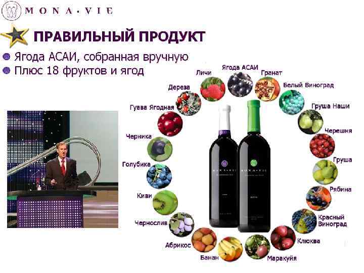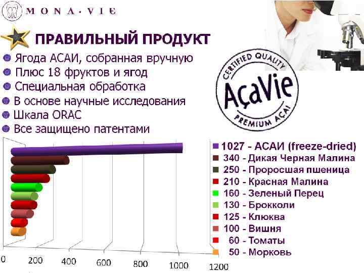 ACAI • ЯГОДА АСАИ СОДЕРЖИТ: • БОЛЬШЕ АНТИОКСИДАНТОВ, ЧЕМ ЛЮБОЙ ДРУГОЙ СЪЕДОБНЫЙ ПЛОД НА ЗЕМЛЕ. • ТАКОЕ ЖЕ КОЛИЧЕСТВО БЕЛКОВ, КАК И КОРОВЬЕ МОЛОКО, А ПО ЭНЕРГЕТИЧЕСКОЙ ЦЕННОСТИ И СОДЕРЖАНИЮ ЖИРОВ ДАЖЕ ЕГО ОПЕРЕЖАЕТ. • ВИТАМИН А • ВИТАМИН В 1 (ТИАМИН) • ВИТАМИН В 2 (РИБОФЛАВИН) • ВИТАМИН В 3 (НИКОТИНОВАЯ КИСЛОТА) • ВИТАМИН С (АСКОРБИНОВАЯ КИСЛОТА) • ВИТАМИН Е (ТОКОФЕРОЛ) • ВИТАМИН D • ЖЕЛЕЗО • КАЛИЙ • ФОСФОР • КАЛЬЦИЙ • НЕЗАМЕНИМЫЕ ЖИРНЫЕ КИСЛОТЫ ОМЕГА-3, ОМЕГА-6 И ОМЕГА-9 • ЦИАНИДИН • ФИТОСТЕРОЛЫ • ПОЛИФЕНОЛЫ