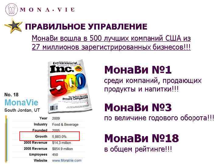 АБСОЛЮТНЫЕ МИРОВЫЕ РЕКОРДЫ Самая быстрая скорость по созданию объема продаж в миллиард долларов! Самая молодая и динамичная на земле компания миллиардер. Самые большие гонорары, выплачиваемые партнерам компании. ЦИФРЫ И ФАКТЫ Microsoft 1 милрд. 11 лет Apple 1 милрд. 7 лет Mona. Vie 1 милрд. 3, 5 года