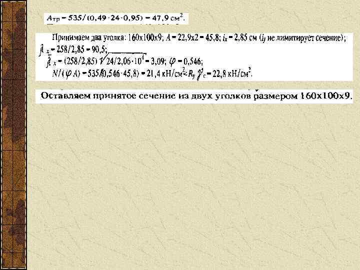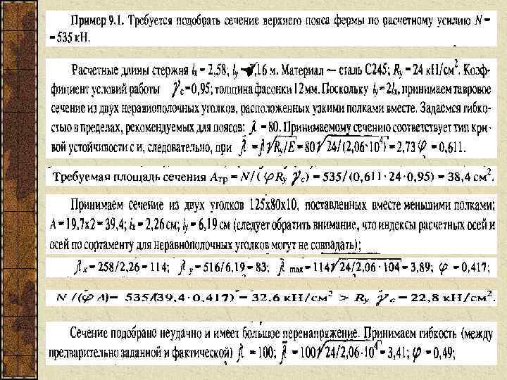 Если гибкость стержня предварительно была задана неправильно проверка показала перенапряжение или значительное (больше 510%) недонапряжение, то проводят корректировку сечения, принимая промежуточное между предварительно заданным и фактическим значениями гибкости Обычно второе приближение достигает цели Для составных сечений предельные гибкости полок и стенок определяются в соответствии с нормами