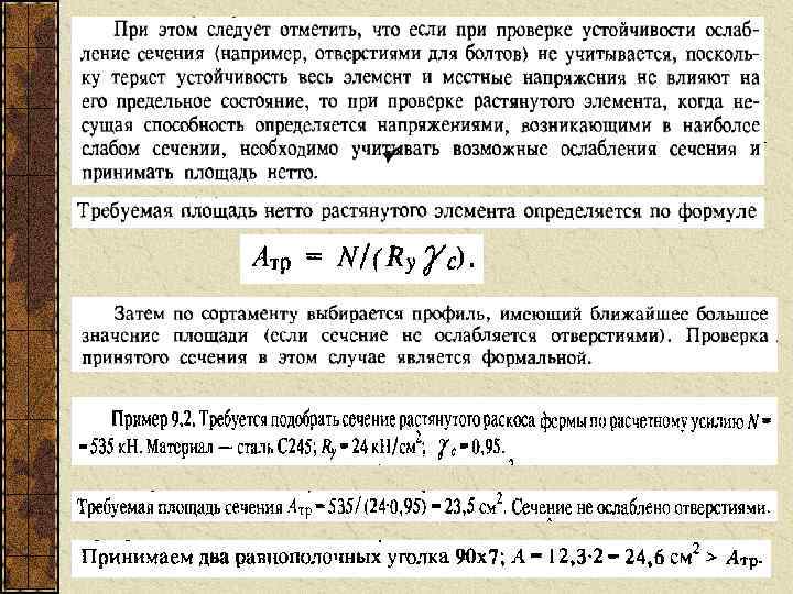 ПОДБОР СЕЧЕНИЯ РАСТЯНУТЫХ ЭЛЕМЕНТОВ Предельное состояние растянутых элементов определяется либо их разрывом Либо развитием чрезмерных пластических дефомаций