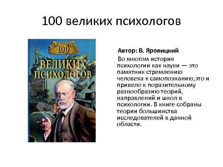 100 великих психологов Автор: В. Яровицкий Во многом история психологии как науки — это памятник стремлению человека к самопознанию, это и привело к поразительному разнообразию теорий, направлений и школ в психологии. В книге собраны теории большинства исследователей в данной области.
