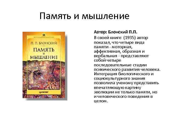Память и мышление Автор: Блонский П. П. В своей книге (1935) автор показал, что четыре вида памяти - моторная, аффективная, образная и вербальная - представляют собой четыре последовательные стадии психического развития человека. Интеграция биологического и социокультурного знания позволила ученому представить впечатляющую картину эволюции не только памяти, но и человеческого поведения в целом.