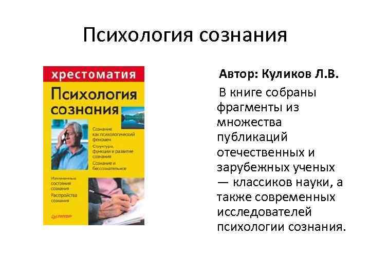 Психология сознания Автор: Куликов Л. В. В книге собраны фрагменты из множества публикаций отечественных и зарубежных ученых — классиков науки, а также современных исследователей психологии сознания.