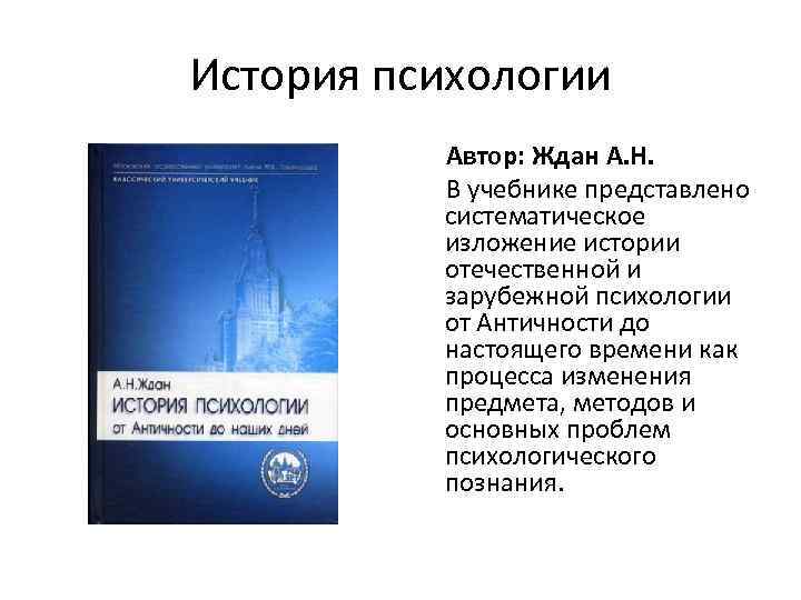 История психологии Автор: Ждан А. Н. В учебнике представлено систематическое изложение истории отечественной и зарубежной психологии от Античности до настоящего времени как процесса изменения предмета, методов и основных проблем психологического познания.
