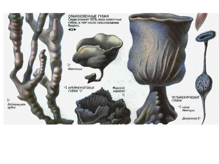 • Класс Calcarea – известковые губки • Класс Hyalospongia – стеклянные губки • Класс Demospongia – обыкновенные губки