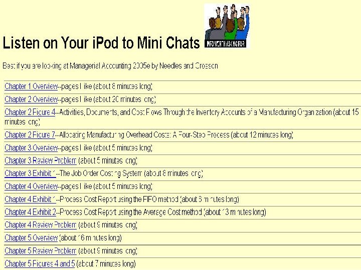 i. Pods…. . Consider the possibilities • Record and playback classes • Chapter overviews—highlight favorite pages or LOs (learning objectives) • End-of-chapter coaching of review problem to model problem solving process • Explanations of textbook visuals, i. e. , exhibits, figures • Podcasts-audio or video broadcasts available on the Internet – I hear, therefore I learn