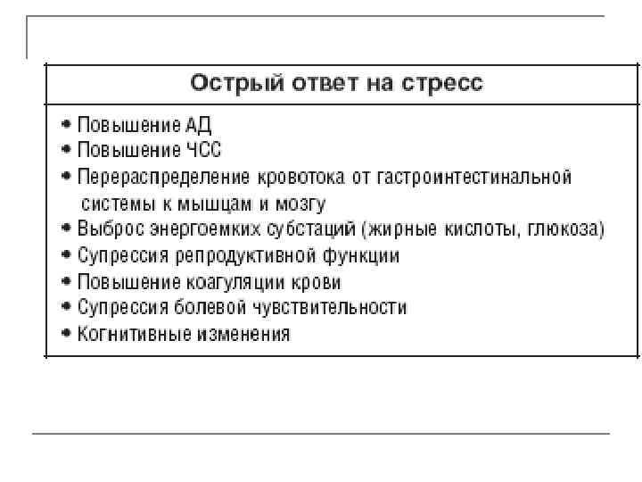 ПОСЛЕДСТВИЯ ХРОНИЧЕСКОГО СТРЕССА • хроническая усталость; • пониженный фон настроения; • раздражительность; • апатия; • нарушений сна; • снижение сексуальной потенции; • «эмоционально выгорание» ; • психосоматические заболевания ( «болезни адаптации» - по Селье) - гипертоническая болезнь, стенокардия, язва желудка, колиты, бронхиальная астма, сахарный диабет 2 типа (метаболический синдром), ряд заболеваний кожи и волос (экзема, нейродермит, псориаз, очаговая и системная алопеция) и ряд других.
