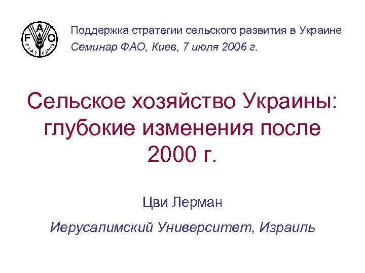 Поддержка стратегии сельского развития в Украине Семинар ФАО, Киев, 7 июля 2006 г. Сельское хозяйство Украины: глубокие изменения после 2000 г. Цви Лерман Иерусалимский Университет, Израиль