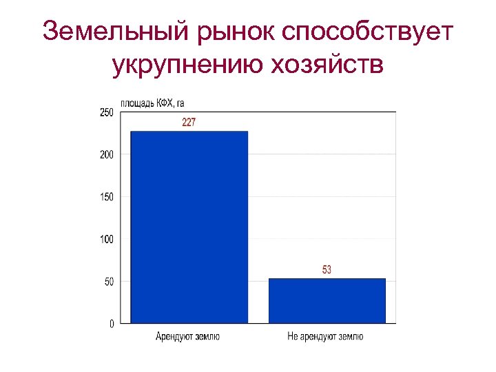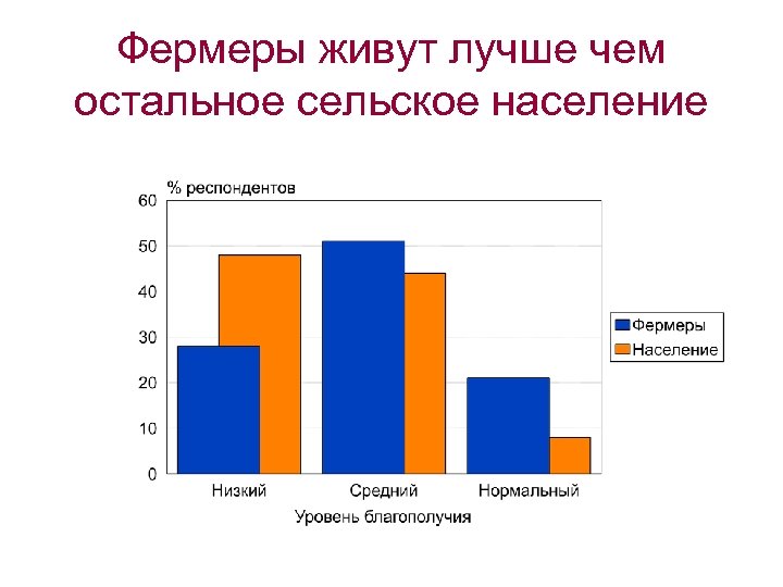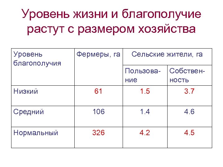 Уровень жизни и благополучие растут с размером хозяйства Уровень благополучия Фермеры, га Сельские жители, га Пользование Собственность Низкий 61 1. 5 3. 7 Средний 106 1. 4 4. 6 Нормальный 326 4. 2 4. 5