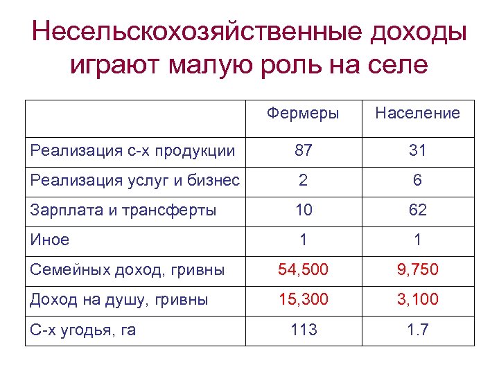 Несельскохозяйственные доходы играют малую роль на селе Фермеры Население Реализация с-х продукции 87 31 Реализация услуг и бизнес 2 6 Зарплата и трансферты 10 62 Иное 1 1 Семейных доход, гривны 54, 500 9, 750 Доход на душу, гривны 15, 300 3, 100 113 1. 7 С-х угодья, га
