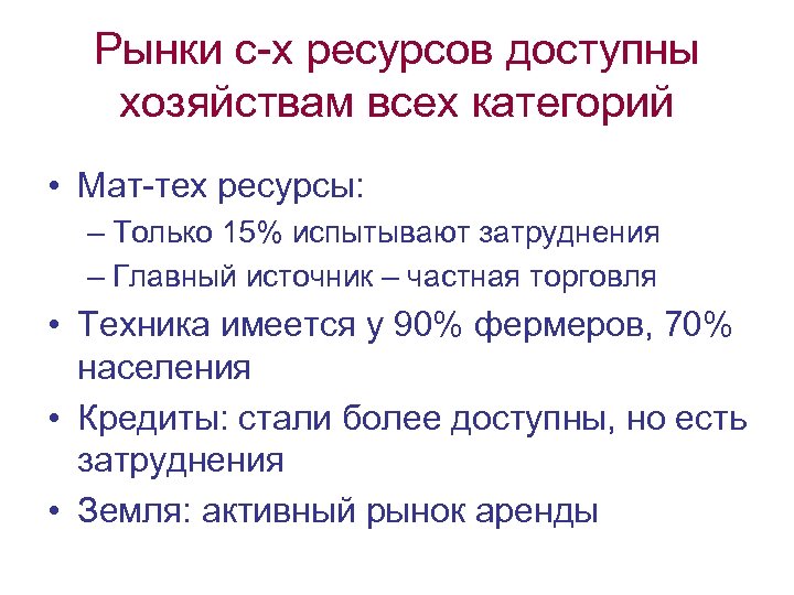 Рынки с-х ресурсов доступны хозяйствам всех категорий • Мат-тех ресурсы: – Только 15% испытывают затруднения – Главный источник – частная торговля • Техника имеется у 90% фермеров, 70% населения • Кредиты: стали более доступны, но есть затруднения • Земля: активный рынок аренды