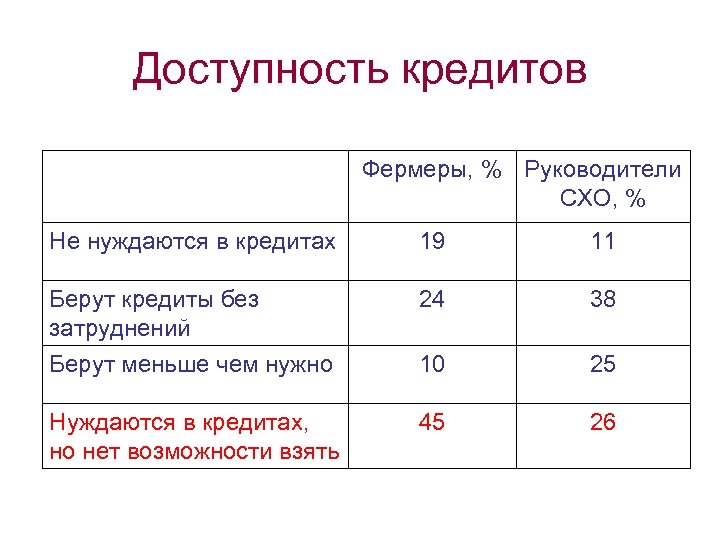 Доступность кредитов Фермеры, % Руководители СХО, % Не нуждаются в кредитах 19 11 Берут кредиты без затруднений 24 38 Берут меньше чем нужно 10 25 Нуждаются в кредитах, но нет возможности взять 45 26