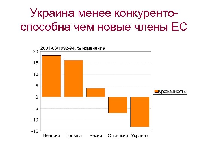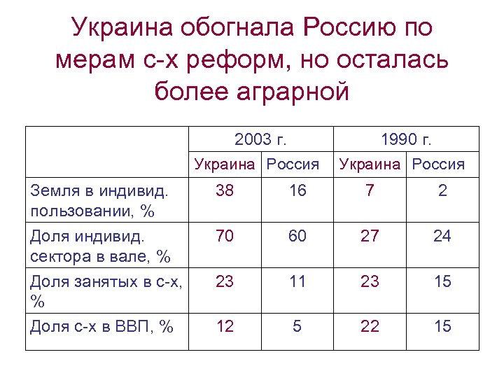 Украина обогнала Россию по мерам с-х реформ, но осталась более аграрной 2003 г. Украина Россия 1990 г. Украина Россия Земля в индивид. пользовании, % 38 16 7 2 Доля индивид. сектора в вале, % Доля занятых в с-х, % Доля с-х в ВВП, % 70 60 27 24 23 11 23 15 12 5 22 15