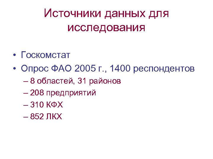Источники данных для исследования • Госкомстат • Опрос ФАО 2005 г. , 1400 респондентов – 8 областей, 31 районов – 208 предприятий – 310 КФХ – 852 ЛКХ