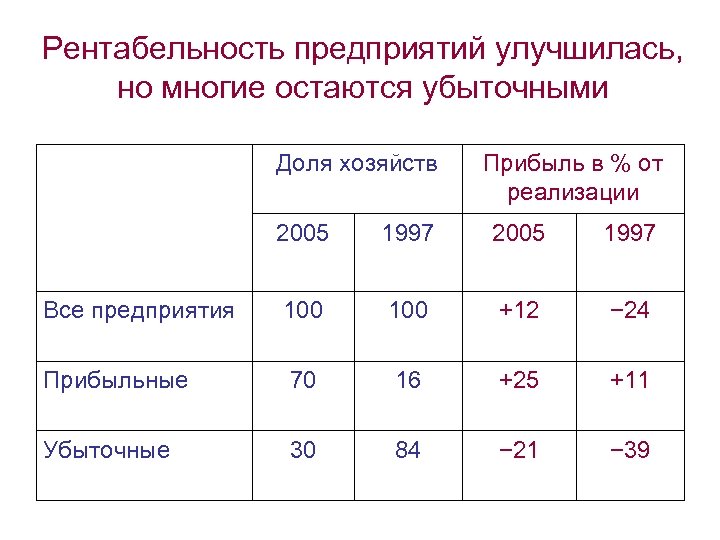 Рентабельность предприятий улучшилась, но многие остаются убыточными Доля хозяйств Прибыль в % от реализации 2005 1997 Все предприятия 100 +12 − 24 Прибыльные 70 16 +25 +11 Убыточные 30 84 − 21 − 39