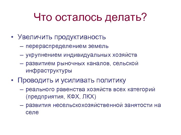 Что осталось делать? • Увеличить продуктивность – перераспределением земель – укрупнением индивидуальных хозяйств – развитием рыночных каналов, сельской инфраструктуры • Проводить и усиливать политику – реального равенства хозяйств всех категорий (предприятия, КФХ, ЛКХ) – развития несельскохозяйственной занятости на селе