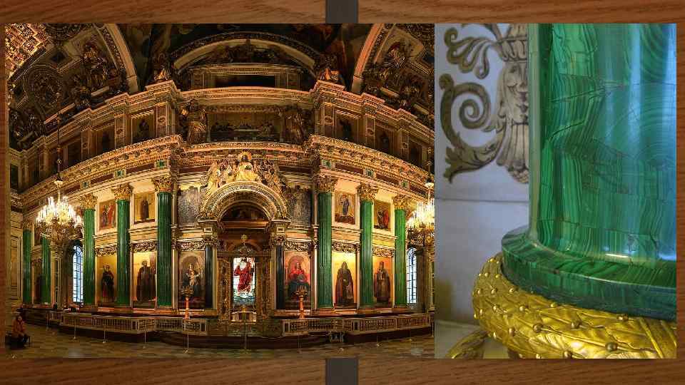 Малахит • Одним из самых любимых и характерных для Урала самоцветов, является малахит, который стал добываться в большом объеме после открытия медных рудников. В те времена из рудников Гумешевска и Меднорудянска темно- и светло-зеленого изумруд извлекали тысячами пудов. Плохие сорта и обломки минерала истирали на краску. А из более высоких сортов мастера научились изготавливать потрясающие изделия методом, который впоследствии получил название «русская мозаика» . Для этого фрагменты малахита распиливались на пластины толщиною в несколько миллиметров. В дальнейшем из пластин на металле или мраморе согласно рисунку камня. При этом швы настолько тщательно подгонялись, что создавалось впечатление монолитности. Способ был изобретен во второй половине XVIII столетия. Русские мастера подобно фанере облицовывали уральским малахитом огромные чаши, столы, вазы и колонны.