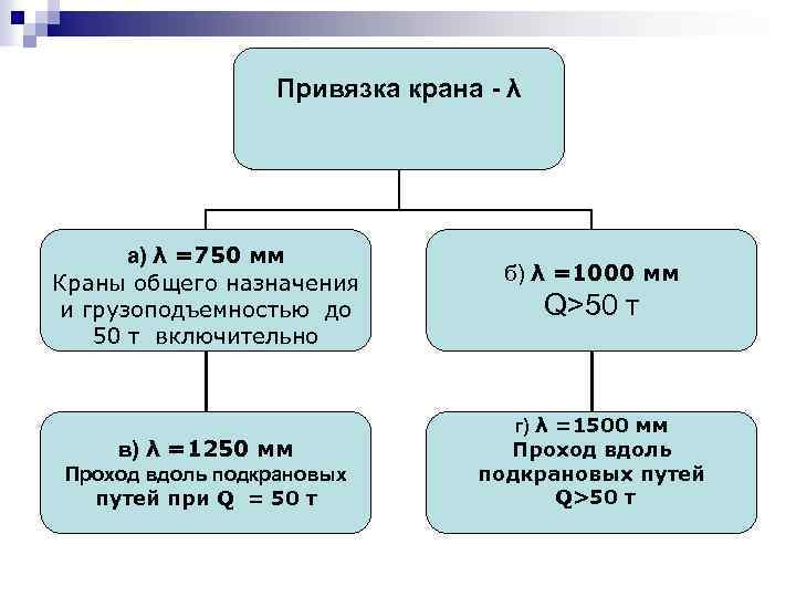 Привязка крана - λ а) λ =750 мм Краны общего назначения и грузоподъемностью до 50 т включительно в) λ =1250 мм Проход вдоль подкрановых путей при Q = 50 т б) λ =1000 мм Q>50 т г) λ =1500 мм Проход вдоль подкрановых путей Q>50 т