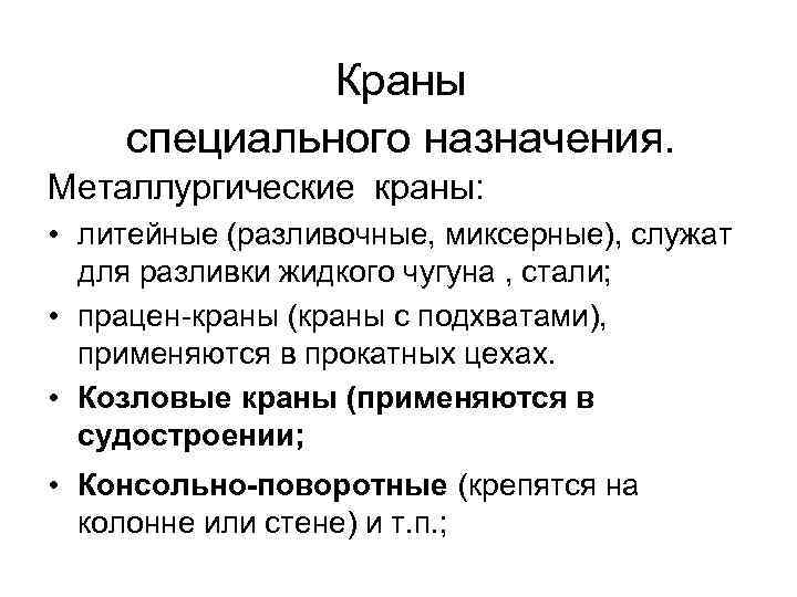 Краны специального назначения. Металлургические краны: • литейные (разливочные, миксерные), служат для разливки жидкого чугуна , стали; • працен-краны (краны с подхватами), применяются в прокатных цехах. • Козловые краны (применяются в судостроении; • Консольно-поворотные (крепятся на колонне или стене) и т. п. ;