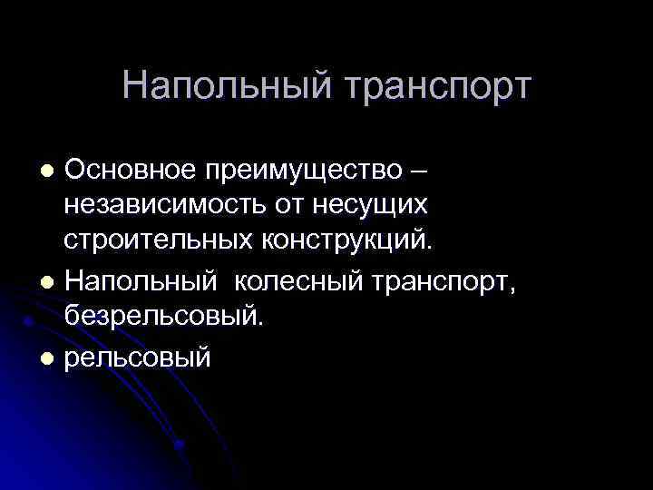 Напольный транспорт Основное преимущество – независимость от несущих строительных конструкций. l Напольный колесный транспорт, безрельсовый. l рельсовый l