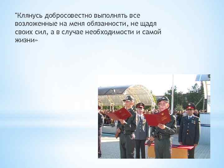 "Клянусь добросовестно выполнять все возложенные на меня обязанности, не щадя своих сил, а в случае необходимости и самой жизни»