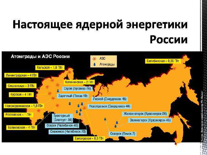 § В современных условиях атомная энергетика — один из важнейших секторов экономики России, который активно развивается. Общее количество строящихся энергоблоков в России – 9. В 2015 году планируется достроить энергоблок № 1 Нововоронежской АЭС-2. Также планируется завершить сооружение плавучей АЭС «Академик Ломоносов» с двумя реакторами КЛТ 40 С и ввести в промышленную эксплуатацию энергоблок Белоярской АЭС с реактором БН-800, продолжается строительство Ленинградской АЭС-2. § Высокое качество выпускаемой продукции и предлагаемых услуг подтверждается успехами в международных тендерах на строительство АЭС за пределами страны. Портфель зарубежных заказов Росатома по итогам 2014 года превысил 100 млрд. долларов. Сегодня Россия – мировой лидер по количеству энергоблоков, сооружаемых за рубежом: Госкорпорация «Росатом» подписала контракты на строительство за границей 29 атомных энергоблоков. В частности, ведется сооружение АЭС «Аккую» (Турция), Белорусской АЭС (Беларусь), второй очереди АЭС «Бушер» (Иран), АЭС «Куданкулам» (Индия), АЭС «Ниньтхуан» (Вьетнам), АЭС «Руппур» (Бангладеш), второй очереди Тяньваньской АЭС (Китай), АЭС «Ханхикиви-1» (Финляндия), АЭС «Пакш» (Венгрия).