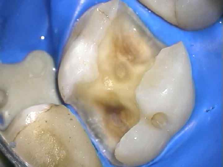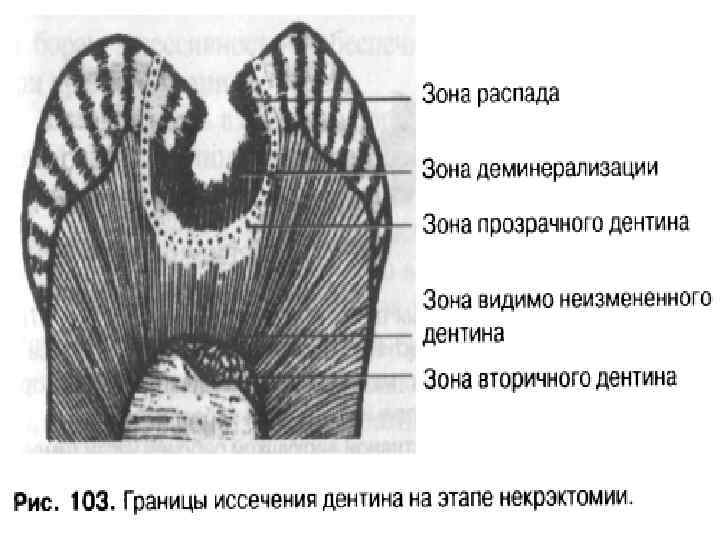 В целом этап некрэктомии при полостях 2 -го класса выполняется по общим правилам: - полное удаление размягченного и пигментированного дентина; - удаление пораженного дентина проводится либо экскаватором , либо шаровидными борами больших размеров; - после удаления деминерализованного дентина рекомендуется иссечь тонкий слой пограничного дентина ( до 1 мм) шаровидным бором на малой скорости. - допускается оставление на дне полости пигментированного, но плотного, “крепетирующего” дентина; -для определения оптимального объема дентина, подлежащего иссечению, следует использовать кариесмаркеры.