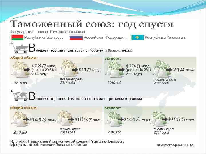 1. Для частных лиц ограничение на ввоз товара внутри союза расширилось с 35 до 50 кг. 2. Во всех странах ТС демонстрируют устойчивый рост фармацевтическая промышленность, производство строительных материалов, пластмассовых и резиновых изделий. 3. Сократилось время, необходимое на оформление товаров на таможне. 4. Сократились расходы на товарооборот между странами. 5. Союз позволил России диверсифицировать экспорт. 6. Союз оказал благотворное влияние на укрепление всестороннего сотрудничества стран-участниц. 7. Государства имеют положительный торговый баланс с внешним миром.