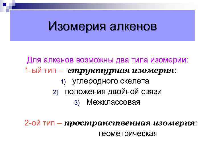 Изомерия алкенов Для алкенов возможны два типа изомерии: 1 -ый тип – структурная изомерия: 1) углеродного скелета 2) положения двойной связи 3) Межклассовая 2 -ой тип – пространственная изомерия: геометрическая