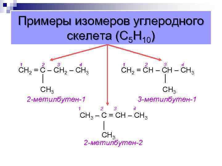 Примеры изомеров углеродного скелета (С 5 Н 10) 1 2 3 4 1 СН 2 = С – СН 2 – СН 3 2 4 СН 2 = СН – СН 3 2 -метилбутен-1 1 3 СН 3 3 -метилбутен-1 2 3 4 СН 3 – С = СН – СН 3 2 -метилбутен-2