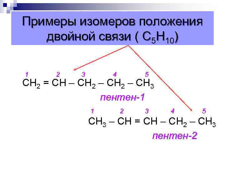 Примеры изомеров положения двойной связи ( С 5 Н 10) 1 2 3 4 5 СН 2 = СН – СН 2 – СН 3 пентен-1 1 2 3 4 5 СН 3 – СН = СН – СН 2 – СН 3 пентен-2