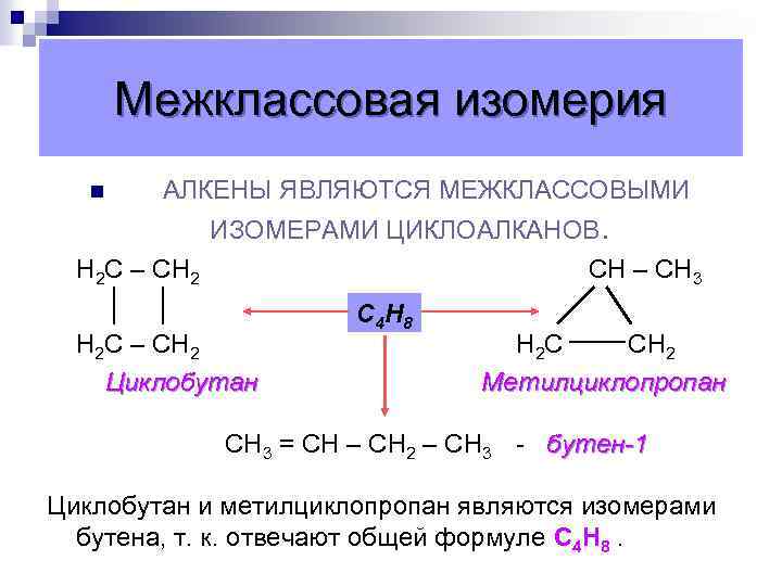 Межклассовая изомерия n АЛКЕНЫ ЯВЛЯЮТСЯ МЕЖКЛАССОВЫМИ ИЗОМЕРАМИ ЦИКЛОАЛКАНОВ. Н 2 С – СН 2 СН – СН 3 Н 2 С – СН 2 Циклобутан С 4 Н 8 Н 2 С СН 2 Метилциклопропан СН 3 = СН – СН 2 – СН 3 - бутен-1 Циклобутан и метилциклопропан являются изомерами бутена, т. к. отвечают общей формуле С 4 Н 8.