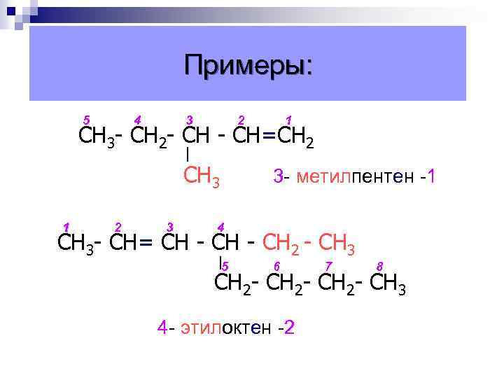 Примеры: 5 4 3 2 1 СН 3 - СН 2 - СН=СН 2 СН 3 1 2 3 3 - метилпентен -1 4 СН 3 - СН= СН - СН 2 - СН 3 5 6 7 8 СН 2 - СН 3 4 - этилоктен -2