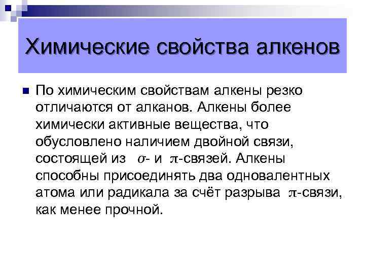 Химические свойства алкенов n По химическим свойствам алкены резко отличаются от алканов. Алкены более химически активные вещества, что обусловлено наличием двойной связи, состоящей из σ- и π-связей. Алкены способны присоединять два одновалентных атома или радикала за счёт разрыва π-связи, как менее прочной.