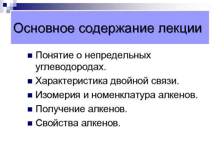Основное содержание лекции Понятие о непредельных углеводородах. n Характеристика двойной связи. n Изомерия и номенклатура алкенов. n Получение алкенов. n Свойства алкенов. n