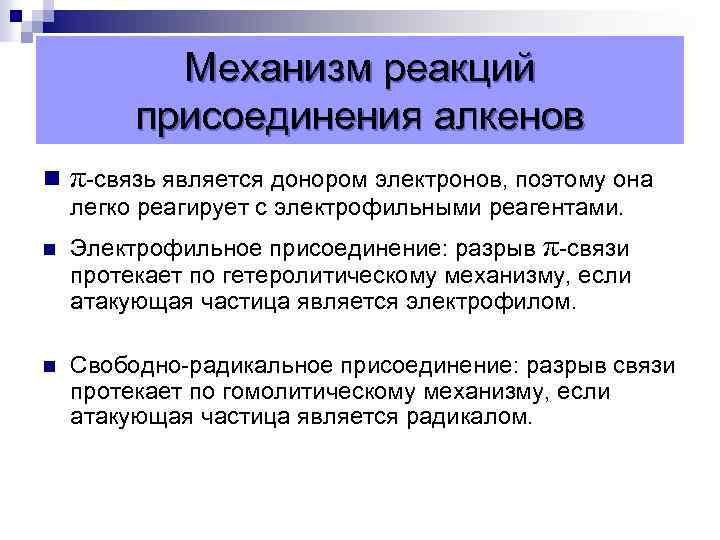 Механизм реакций присоединения алкенов n π-связь является донором электронов, поэтому она легко реагирует с электрофильными реагентами. n n Электрофильное присоединение: разрыв π-связи протекает по гетеролитическому механизму, если атакующая частица является электрофилом. Свободно-радикальное присоединение: разрыв связи протекает по гомолитическому механизму, если атакующая частица является радикалом.
