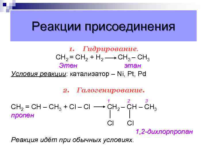 Реакции присоединения 1. Гидрирование. CН 2 = СН 2 + Н 2 СН 3 – СН 3 Этен этан Условия реакции: катализатор – Ni, Pt, Pd 2. Галогенирование. 2 Cl CН 2 = СН – СН 3 + Сl – Сl пропен 1 3 Cl СН 2 – СН 3 1, 2 -дихлорпропан Реакция идёт при обычных условиях.