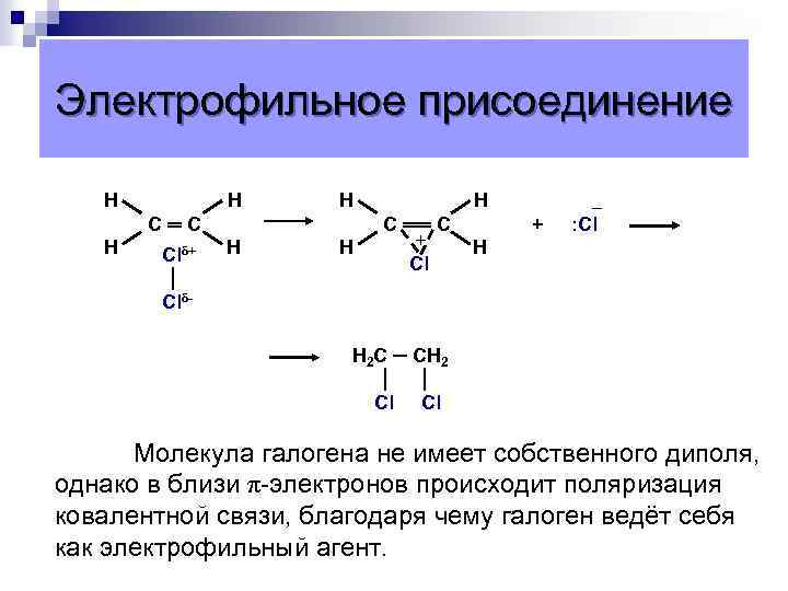 Электрофильное присоединение Н Н Н С═С Н Clδ+ │ Clδ- Н Н Н С ══ С + Cl + ─ : Cl Н H 2 C ─ CH 2 │ │ Cl Cl Молекула галогена не имеет собственного диполя, однако в близи π-электронов происходит поляризация ковалентной связи, благодаря чему галоген ведёт себя как электрофильный агент.